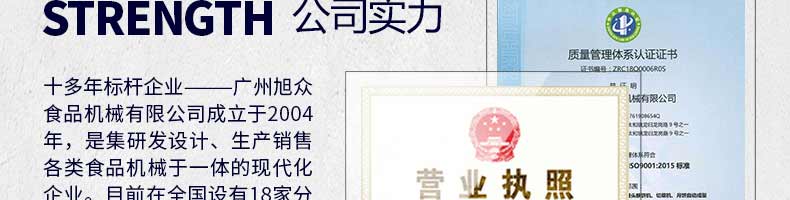 廣州旭眾食品機(jī)械有限公司是一家集科研開發(fā),生產(chǎn)設(shè)計(jì),營(yíng)銷服務(wù)為一體的現(xiàn)代化生產(chǎn)企業(yè)?,F(xiàn)代化生產(chǎn)車間,精湛制造技術(shù),所產(chǎn)機(jī)械歷經(jīng)市場(chǎng)重重考驗(yàn),不斷贏得海內(nèi)外客戶的贊譽(yù)。