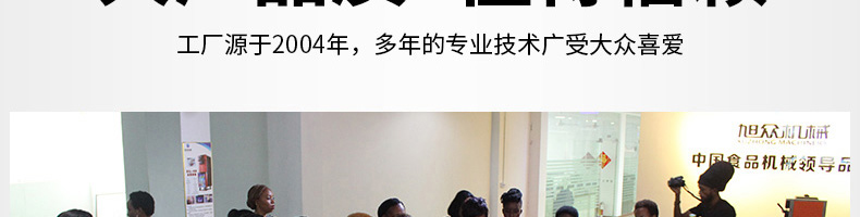 廣州旭眾食品機械有限公司是一家集科研開發(fā),生產(chǎn)設(shè)計,營銷服務(wù)為一體的現(xiàn)代化生產(chǎn)企業(yè)?,F(xiàn)代化生產(chǎn)車間,精湛制造技術(shù),所產(chǎn)機械歷經(jīng)市場重重考驗,不斷贏得海內(nèi)外客戶的贊譽。