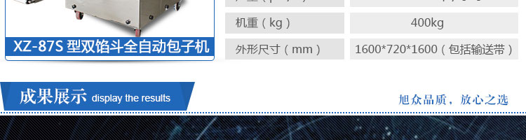 XZ-87S型雙餡斗全自動(dòng)包子機(jī),可生產(chǎn)各種肉包、肉菜包、菜包、小籠包、湯包、水晶包、圓饅頭、奶黃包、豆沙包、叉燒包、南瓜餅等幾十種包餡制品。適用于賓館、飯店、學(xué)校、機(jī)關(guān)企業(yè)食堂、饅頭或包子加工廠、早餐工程店及速凍食品廠等單位??蓾M足不同客戶群體。免費(fèi)提供工藝技術(shù)。免費(fèi)上門培訓(xùn)指導(dǎo)安裝。