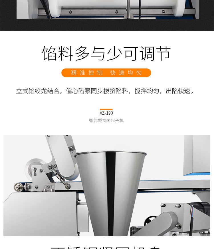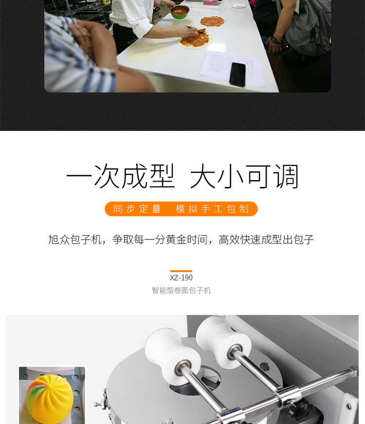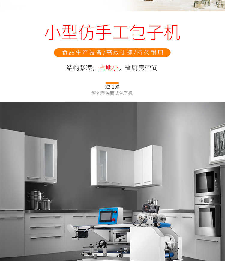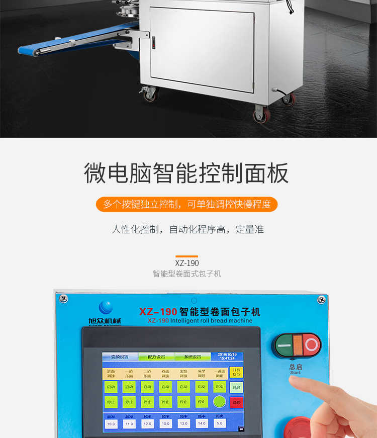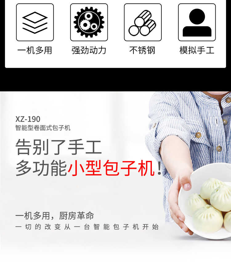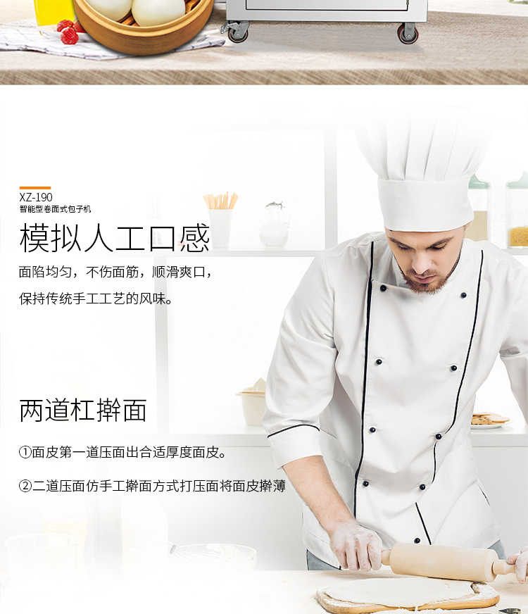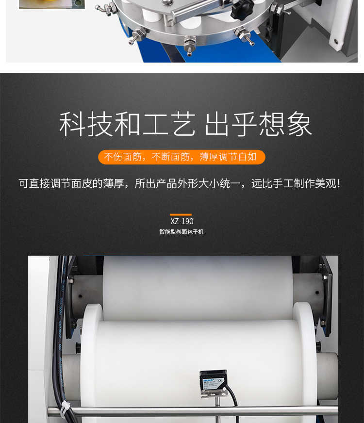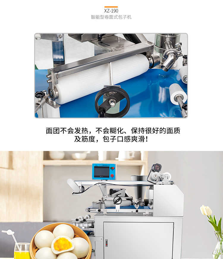XZ-190智能型卷面式包子機,科技和工藝出乎想象不傷面筋,不斷面筋,薄厚調(diào)節(jié)自如可直接調(diào)節(jié)面皮的薄厚,所出產(chǎn)品外形大小統(tǒng)一,遠比手工制作美觀!