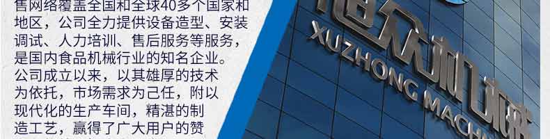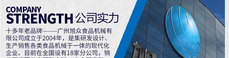廣州旭眾食品機械有限公司是一家集科研開發(fā),生產設計,營銷服務為一體的現(xiàn)代化生產企業(yè)?,F(xiàn)代化生產車間,精湛制造技術,所產機械歷經市場重重考驗,不斷贏得海內外客戶的贊譽。
