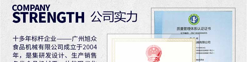 廣州旭眾食品機(jī)械有限公司是一家集科研開發(fā),生產(chǎn)設(shè)計(jì),營銷服務(wù)為一體的現(xiàn)代化生產(chǎn)企業(yè)?,F(xiàn)代化生產(chǎn)車間,精湛制造技術(shù),所產(chǎn)機(jī)械歷經(jīng)市場重重考驗(yàn),不斷贏得海內(nèi)外客戶的贊譽(yù)。