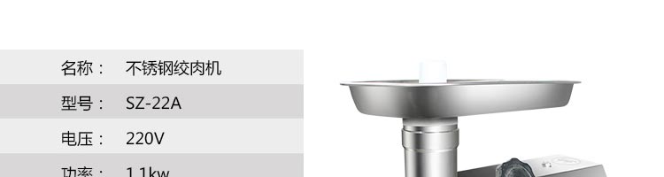 名稱SZ-22A 絞肉機 電源380v 功率1.1kw 產(chǎn)量220千克/小時 尺寸430*210*460mm 重量63kg 規(guī)格 其他