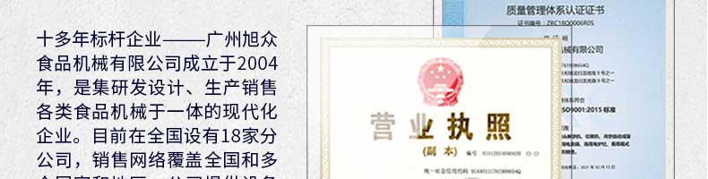 廣州旭眾食品機(jī)械有限公司是一家集科研開發(fā),生產(chǎn)設(shè)計(jì),營銷服務(wù)為一體的現(xiàn)代化生產(chǎn)企業(yè)。現(xiàn)代化生產(chǎn)車間,精湛制造技術(shù),所產(chǎn)機(jī)械歷經(jīng)市場重重考驗(yàn),不斷贏得海內(nèi)外客戶的贊譽(yù)。