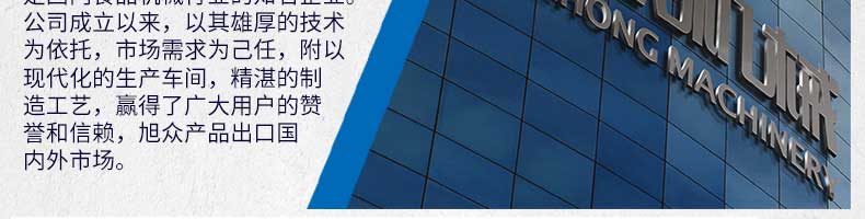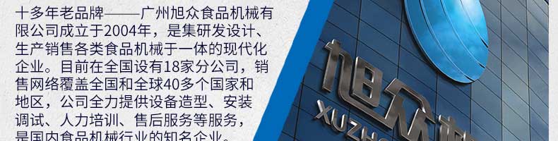 廣州旭眾食品機械有限公司是一家集科研開發(fā),生產(chǎn)設計,營銷服務為一體的現(xiàn)代化生產(chǎn)企業(yè)?,F(xiàn)代化生產(chǎn)車間,精湛制造技術,所產(chǎn)機械歷經(jīng)市場重重考驗,不斷贏得海內(nèi)外客戶的贊譽。