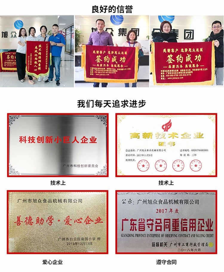 廣州旭眾食品機械有限公司是一家集科研開發(fā),生產(chǎn)設(shè)計,營銷服務(wù)為一體的現(xiàn)代化生產(chǎn)企業(yè)?,F(xiàn)代化生產(chǎn)車間,精湛制造技術(shù),所產(chǎn)機械歷經(jīng)市場重重考驗,不斷贏得海內(nèi)外客戶的贊譽。