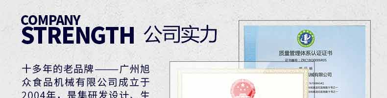 廣州旭眾食品機(jī)械有限公司是一家集科研開發(fā),生產(chǎn)設(shè)計(jì),營銷服務(wù)為一體的現(xiàn)代化生產(chǎn)企業(yè)?,F(xiàn)代化生產(chǎn)車間,精湛制造技術(shù),所產(chǎn)機(jī)械歷經(jīng)市場重重考驗(yàn),不斷贏得海內(nèi)外客戶的贊譽(yù)。