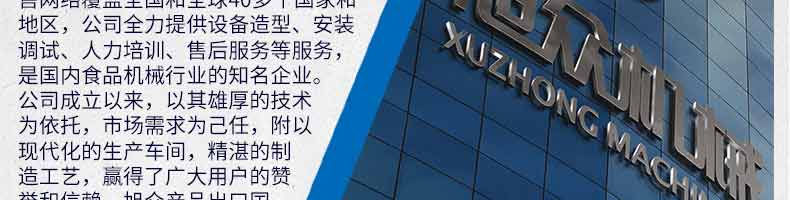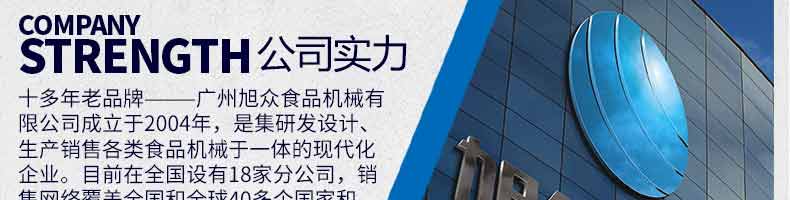 廣州旭眾食品機械有限公司是一家集科研開發(fā),生產(chǎn)設(shè)計,營銷服務(wù)為一體的現(xiàn)代化生產(chǎn)企業(yè)?,F(xiàn)代化生產(chǎn)車間,精湛制造技術(shù),所產(chǎn)機械歷經(jīng)市場重重考驗,不斷贏得海內(nèi)外客戶的贊譽。
