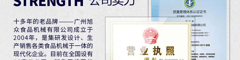 廣州旭眾食品機(jī)械有限公司是一家集科研開(kāi)發(fā),生產(chǎn)設(shè)計(jì),營(yíng)銷服務(wù)為一體的現(xiàn)代化生產(chǎn)企業(yè)?,F(xiàn)代化生產(chǎn)車間,精湛制造技術(shù),所產(chǎn)機(jī)械歷經(jīng)市場(chǎng)重重考驗(yàn),不斷贏得海內(nèi)外客戶的贊譽(yù)。